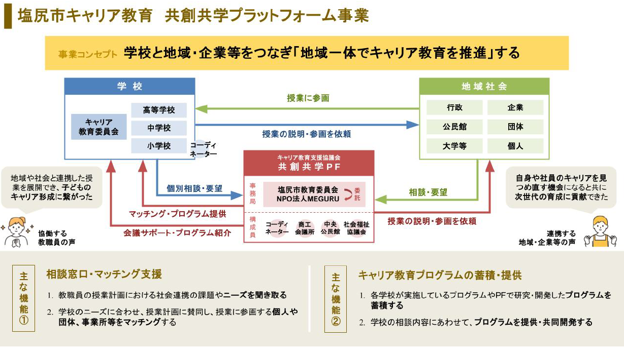 共創共学プラットフォームが目指すのは、学校と地域・企業等をつなぎ「地域一体でキャリア教育を推進する」こと。そのために学校と地域が互いに学び合い、持続的に支え合う教育の仕組みをつくることを目的としています。